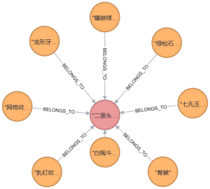 根据上图(图3历史文物知识图谱)即可对文物数据有清晰的认知:在中心位置的是“二里头博物馆文物”,其他八个文物错落有致地环绕在“二里头博物馆文物”周围,并各自通过箭头“BELONGS_TO” 指向中心节点,表示各个文物均属于“二里头博物馆文物”之中。点开单个文物,也可看到单个文物的详细资料,即显示类似于表1的信息数据。最终实现将各个文物以结构化的形式对各位读者进行介绍实验目的。